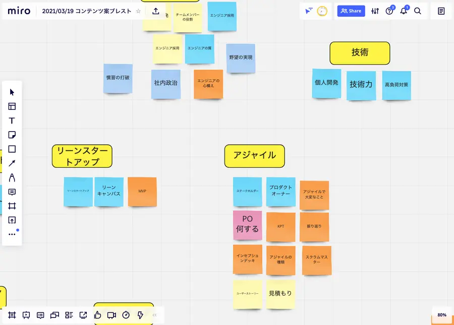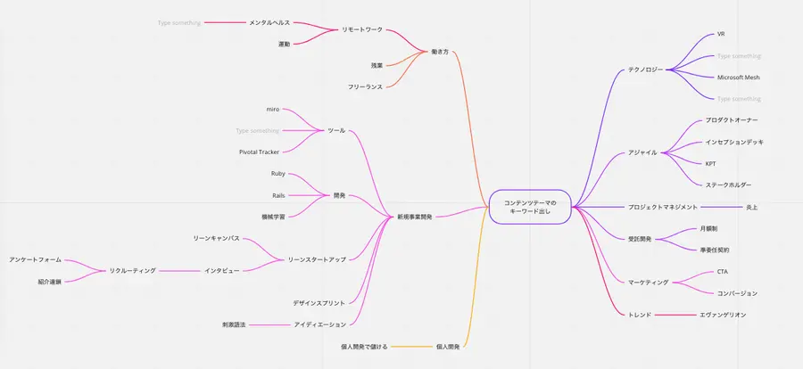 2つ目の方法は「マインドマップ」を活用する方法です。例えば、デッキのキーワードの分野を「開発」にしたい場合、miroなどのツールを活用して発想を広げていきます。