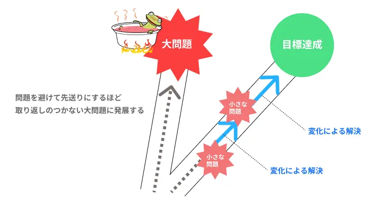 システム開発プロジェクトでの失敗はまるでゆでガエル理論の様相を呈します。問題が小さいうちは、無視してもプロジェクト進行出来てしまいますが、気付かないうちに徐々に徐々に進行して、最後の最後に手を付けられないくらいに深刻になった状態で顕在化します。だから問題が小さいうちに、問題の根本を無視せずに行動を起こさなければならないのです。