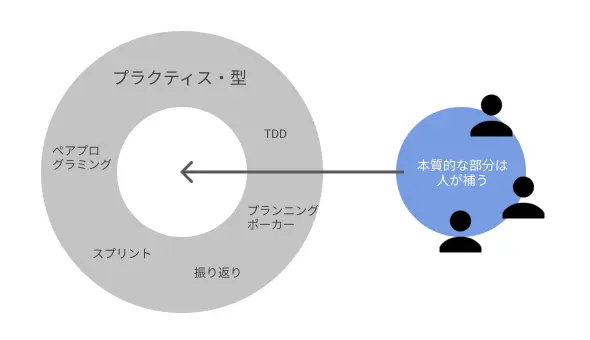 具体的なプラクティスは模倣しやすいので、アジャイル開発を導入しよう!となるとまずはプラクティスの導入からやっていくことが多いのですが、大抵の場合それだけでは失敗します。以前のブログにて言及した通り、アジャイル開発は具体的なプロセスではなく人に依存しています。型だけを導入したところで、人の内面が変わらない限りうまくいくようにはならないのです。