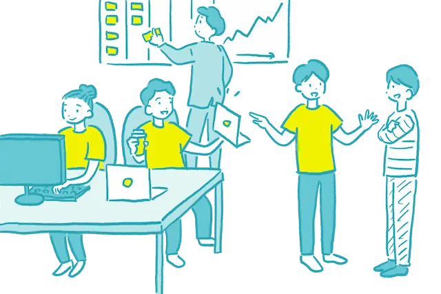 アジャイル開発に適したタスク管理やソースコード管理ツールの導入、週次のイベントの設定などを通してアジャイル開発を行う体制を整えます。定期的に業務フローを見直し、開発体制やプロセスの改善を促進します。