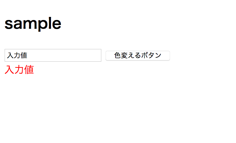 <h2>sample</h2> <input type="text" id="sample_input" data-target="#sample_text"> <input type="button" id="change_color" data-target="#sample_text" value="色変えるボタン"> <div id="sample_text"></div>
